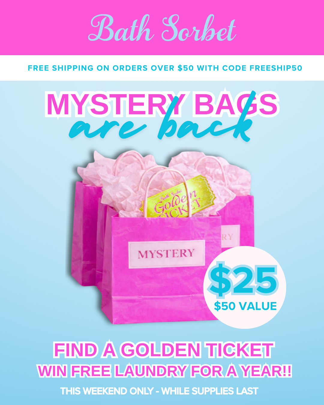 Also one lucky customer will win the Golden Ticket and FREE Laundry for a year!